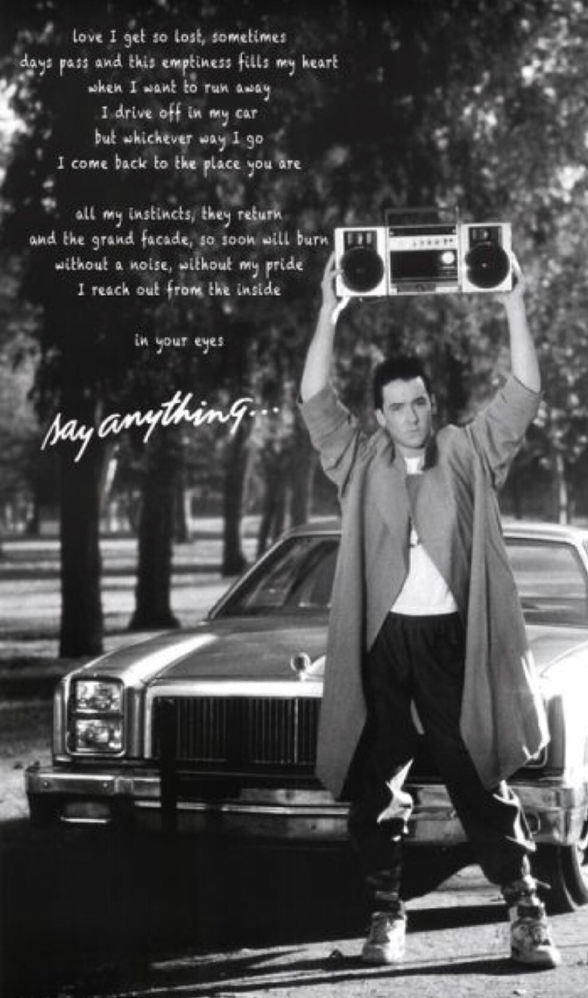 This movie was made in 1989 called Say Anything. I was very young but everyone remembers this scene, at least if you’re a woman or little girl. It doesn’t matter if you were in your 40s or if you were 12 years old. This was a declaration of love. He put his pride aside and stood outside the house of the woman he loves and the song starts. The song is called In Your Eyes by Peter Gabriel. If you don’t know what he’s holding, it’s called a boom box.