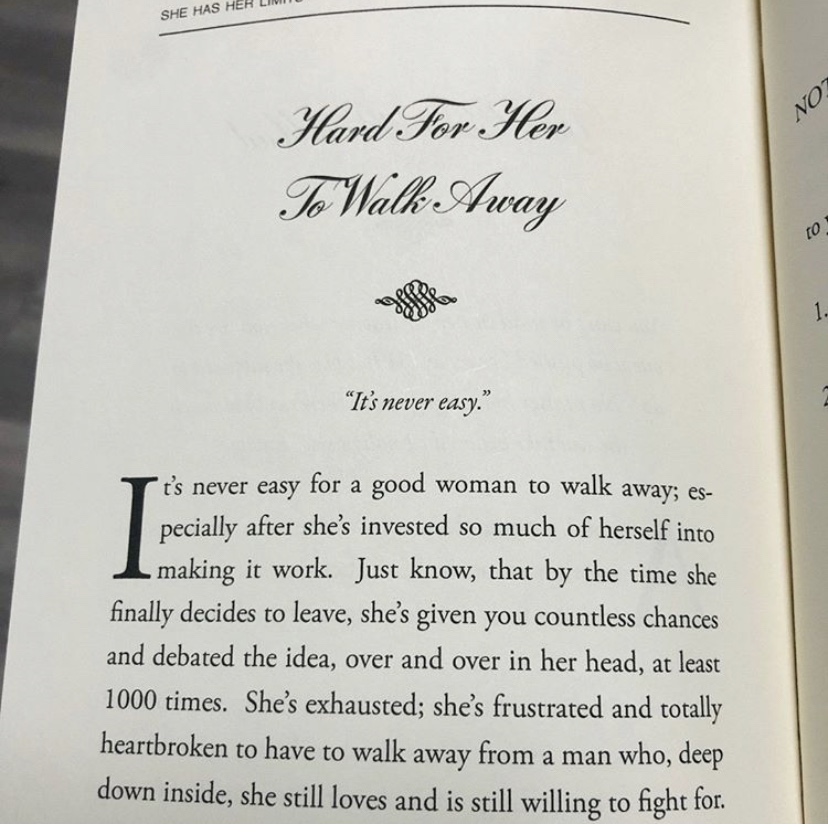 This excerpt was actually written by a man. I was surprised at how accurate this statement was coming from him. It’s completely true that when a woman is ready to leave it came from numerous chances that she gave away.